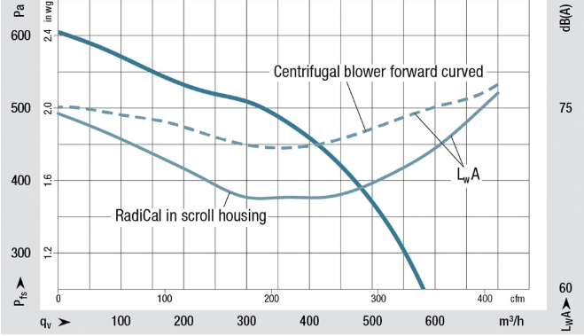 蝸殼型離心風(fēng)機的外殼上有一個橫截面為圓形的出風(fēng)口,可直接連接到機組出風(fēng)管道上。與類似離心鼓風(fēng)機相比,它減少了流量損失,壓力的變化對空氣動力性能的影響很小,效率提高了34%,而噪音排放降低了約3.5 dB(A),從而為住戶提供更加安靜的室內(nèi)居住環(huán)境。