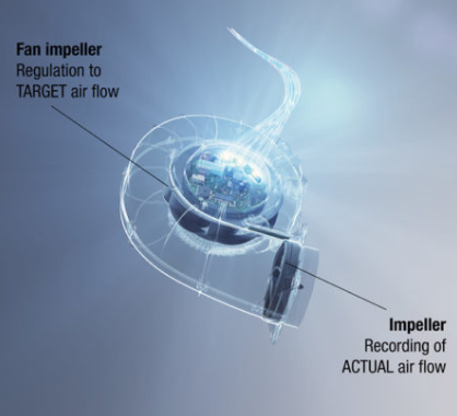 蝸殼型RadiCal離心風(fēng)機集成了可測量空氣流速的葉輪風(fēng)速計,可持續(xù)測量實際空氣流量,并將數(shù)據(jù)反饋到風(fēng)機的集成中央電子控制系統(tǒng)。該控制電子系統(tǒng)根據(jù)設(shè)定值調(diào)節(jié)EC 電機的轉(zhuǎn)速,進而起到調(diào)節(jié)風(fēng)量的作用。借助風(fēng)速計,空氣流量可在風(fēng)機的性能范圍內(nèi),以±1%的精度進行調(diào)節(jié),從而實現(xiàn)恒風(fēng)量控制。