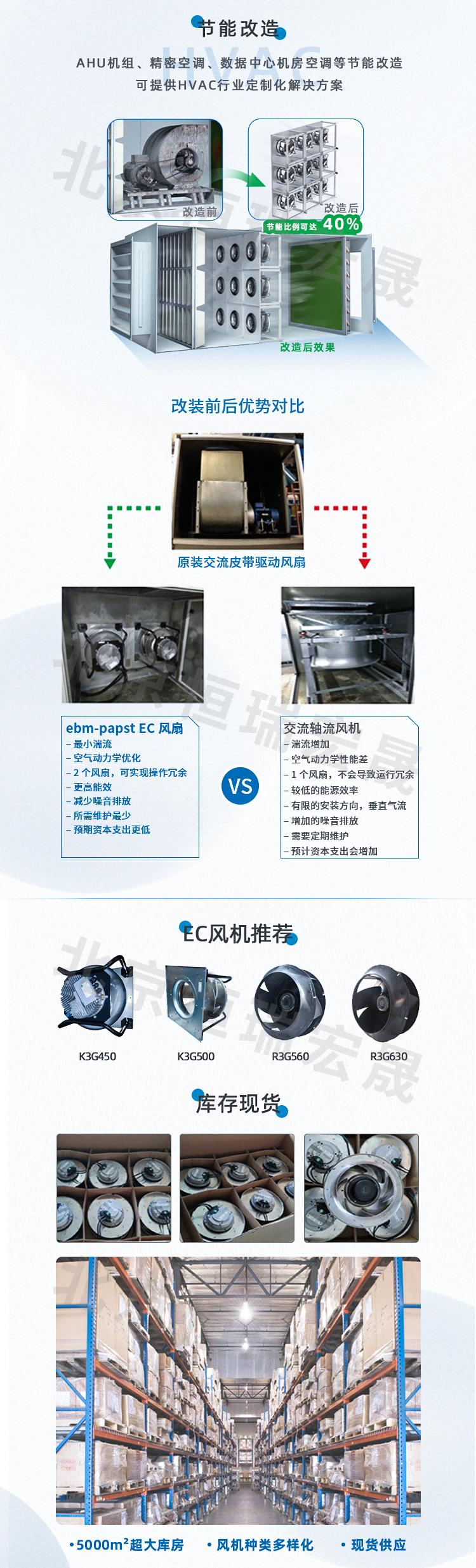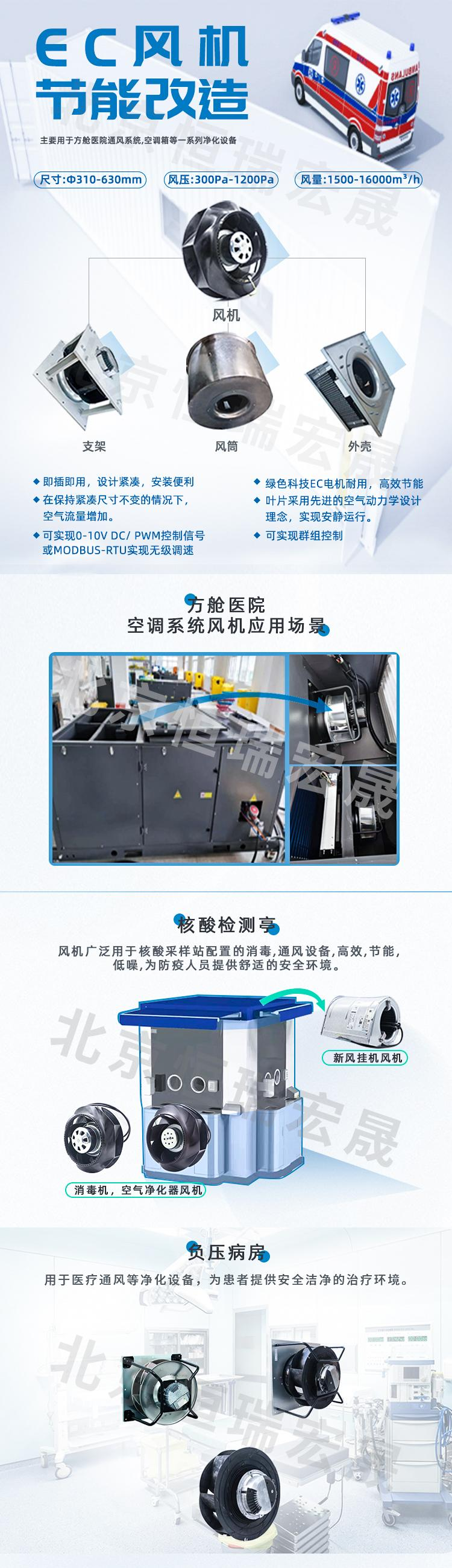 北京恒瑞宏晟專業(yè)供應(yīng)用于方艙醫(yī)院通風(fēng)系統(tǒng)、核酸檢測(cè)亭、負(fù)壓病房、消毒柜、除濕機(jī)等設(shè)備高性能AC/EC風(fēng)機(jī)。同時(shí)具備公共建筑、數(shù)據(jù)機(jī)房、商用建筑等通風(fēng)節(jié)能改造能力及方案,是您節(jié)能改造的最優(yōu)選擇,歡迎廣大客戶朋友考察推薦!