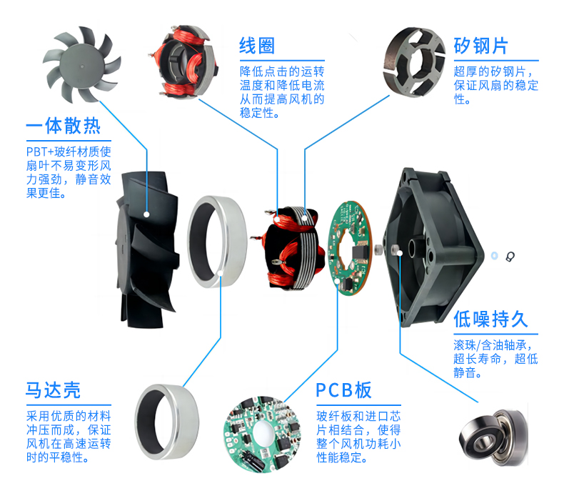 DC(Direct Current,直流)風(fēng)機(jī)指的是使用直流電源驅(qū)動(dòng)的風(fēng)機(jī),其電機(jī)通常是有刷或無刷直流電機(jī)。直流電源的電壓和電流波動(dòng)較大,因此DC風(fēng)機(jī)的輸出功率和機(jī)械效率相對(duì)較低,但可實(shí)現(xiàn)更高的轉(zhuǎn)速和更小的尺寸。同時(shí),DC風(fēng)機(jī)在低速、低負(fù)載運(yùn)行時(shí)具有很好的扭矩性能和控制性能,應(yīng)用于電腦、通信設(shè)備、電動(dòng)工具和小型家電等領(lǐng)域。