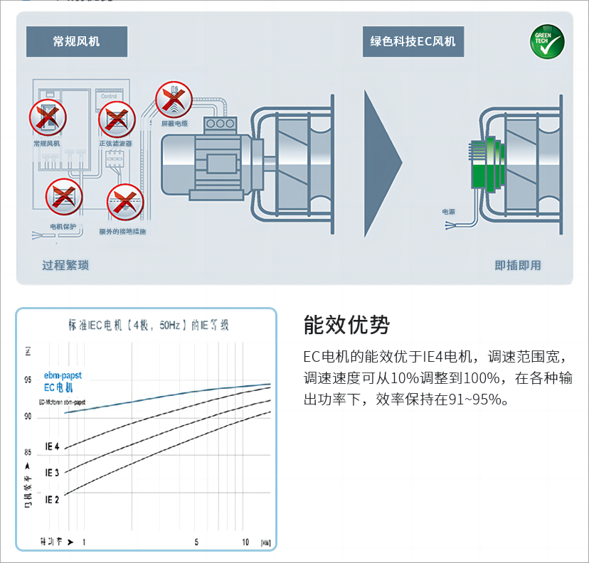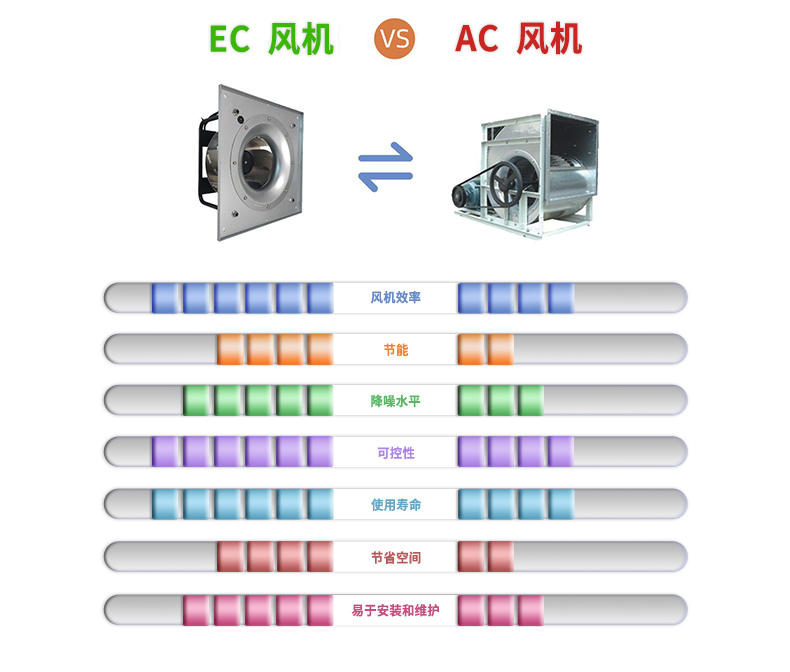 4.在長(zhǎng)期運(yùn)行中,EC風(fēng)機(jī)的能耗比AC風(fēng)機(jī)低,維護(hù)成本也更低。