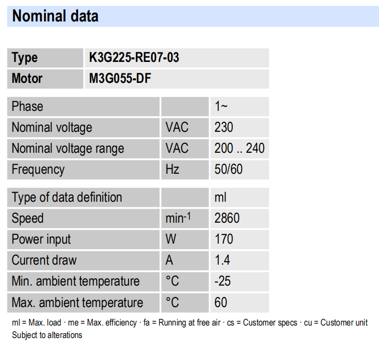 K3G225-RE07-03電壓:240V 電流:1.40A 功率:170W 轉速:2860r/min 頻率:50Hz