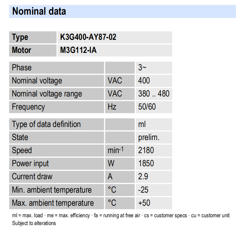 K3G450-RK56-01電壓:380-480V電流:1.50A功率:950W 轉(zhuǎn)速:1550r/min 重量:10.6KG