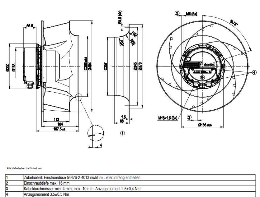 R3G400-AM55-01 風(fēng)機(jī)為后向離心風(fēng)機(jī),帶向后彎曲葉片的 ebm-papst 離心風(fēng)扇主要用于吸入。由于大部分壓力積聚發(fā)生在葉輪中,因此通常不需要滾動(dòng)殼體。離心風(fēng)扇具有非常好的液壓效率和低噪音水平,非常適合高壓。 除了節(jié)能之外,集成控制電子還可以實(shí)現(xiàn)控制、監(jiān)測(cè)和維護(hù)功能。