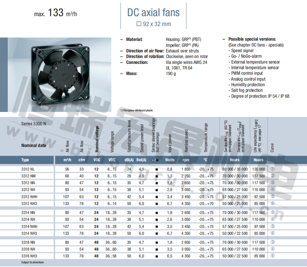 3314NH風(fēng)量:93m³/h 電壓:24v 噪音:38Db 功率:2.6W 轉(zhuǎn)速:3050r/min