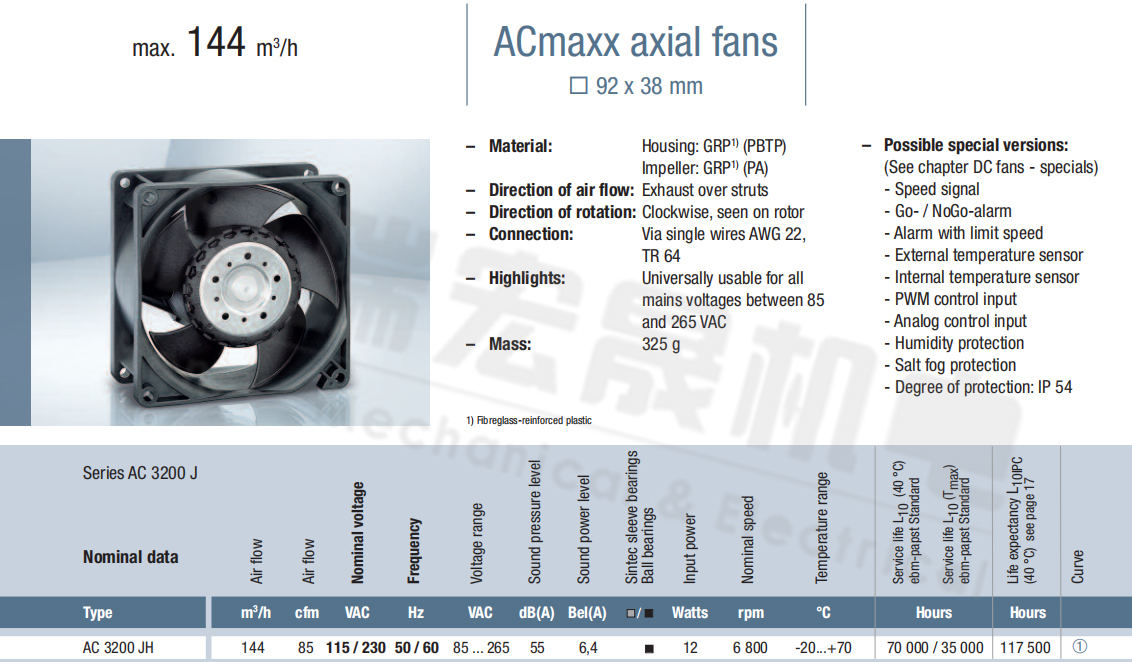Aci4420HH風(fēng)量:175m³/h 電壓:230v 電流:5.3A 功率:4.6W 轉(zhuǎn)速:3300r/min