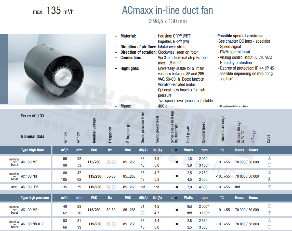 Aci4420HH風量:175m³/h 電壓:230v 電流:5.3A 功率:4.6W 轉(zhuǎn)速:3300r/min