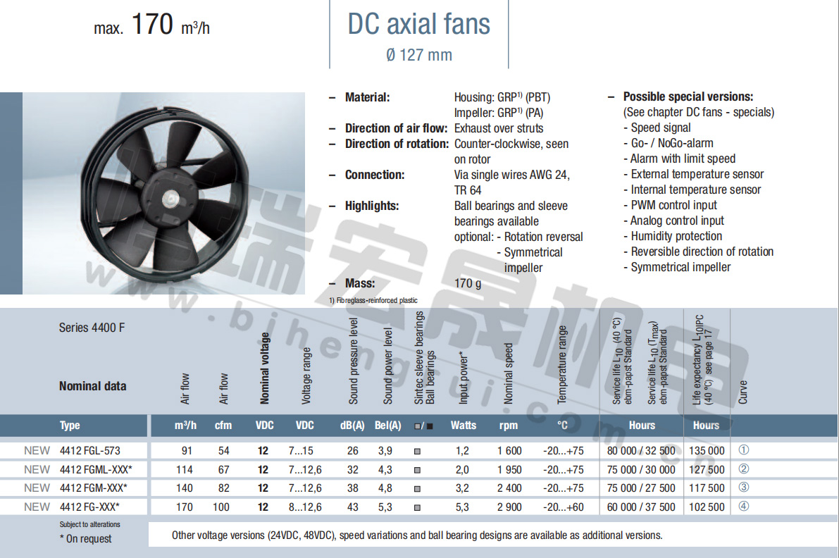 4412FG風(fēng)量:170m³/h 電壓:12v 噪音:43Db 功率:5.3W 轉(zhuǎn)速:2900r/min