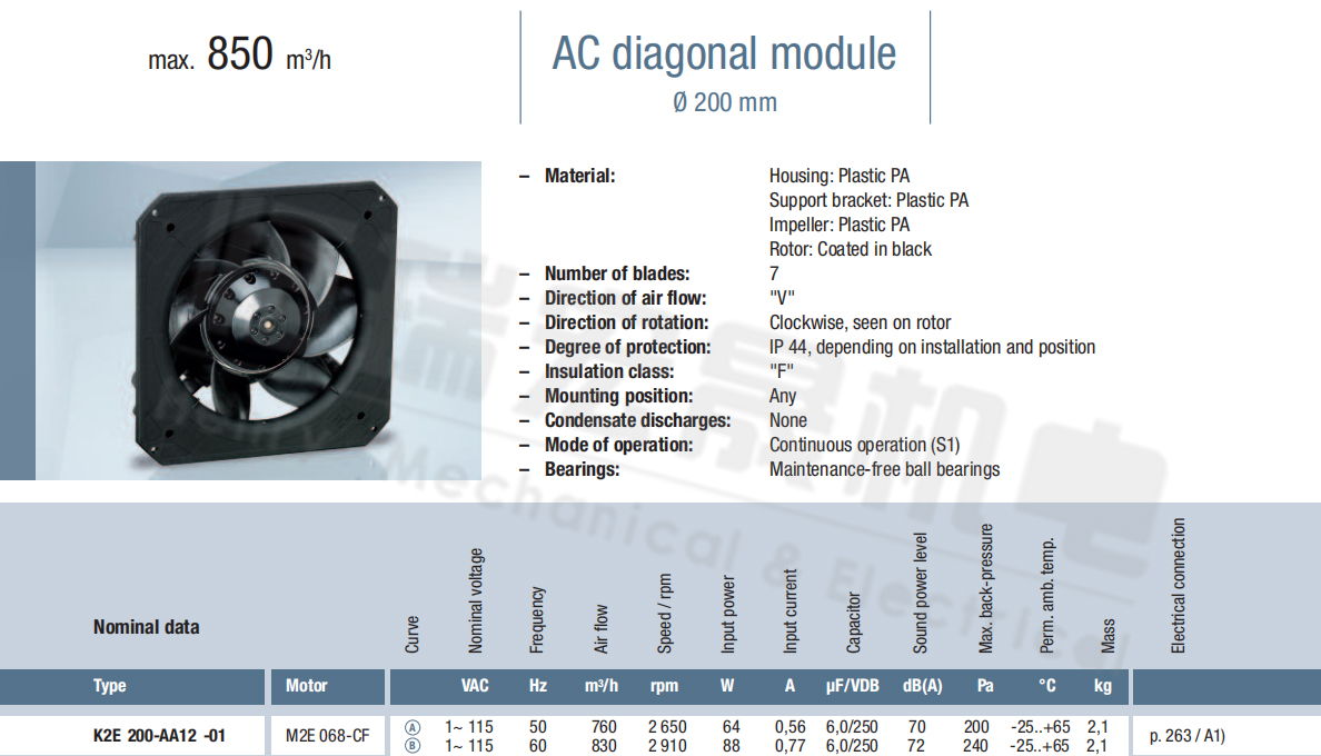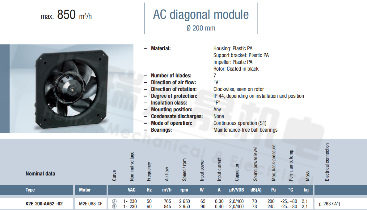 K2E200-AA52-02風(fēng)量:765m³/h 電壓:230v 電流:0.30A 功率:65W 轉(zhuǎn)速:2650r/min