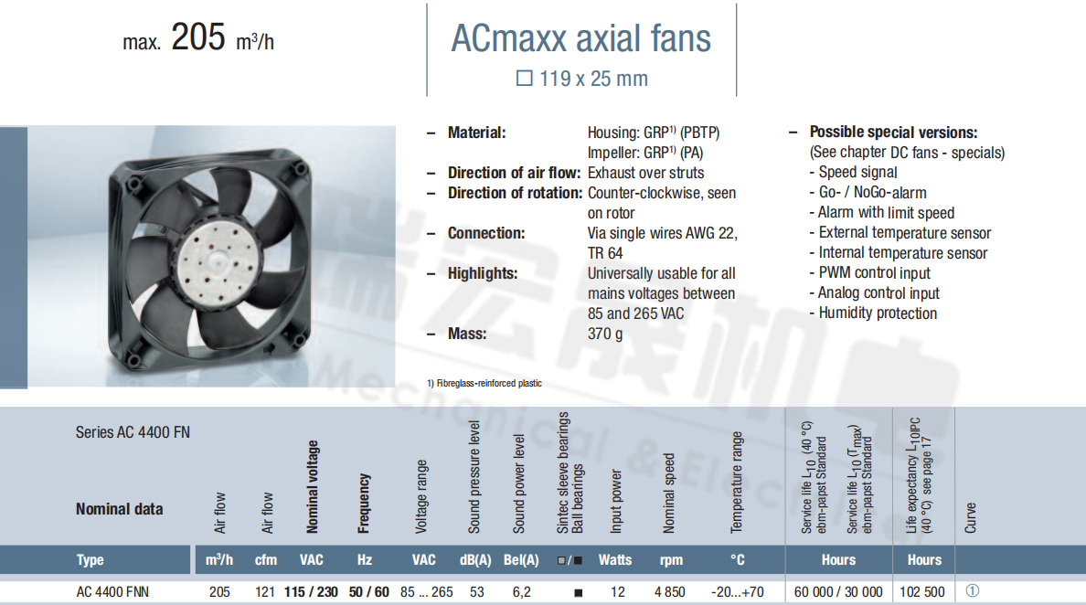 AC4400FNN風(fēng)量:205m³/h 電壓:115v 電流:6.2A 功率:12W 轉(zhuǎn)速:4850r/min